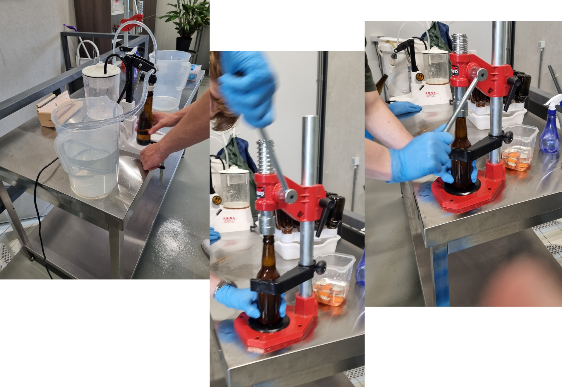 De laatste stap is het bottelen van het bier. Voor het bottelen zelf wordt de Enolmatic gebruikt. Het apparaat bouwt een vacuüm op in de fles die je eronder zet. Door dat vacuüm wordt het bier via een slang vanuit je bottelemmer opgezogen in de fles. De fles vult zich tot een vooraf ingesteld niveau. Hierdoor komt er minder zuurstof bij je bier, wat de houdbaarheid verbetert. Als laatste wordt de kroonkurk op het flesje geplaatst. Met het kroonkurkapparaat wordt de kroonkurk met kracht om de flessenhals geklemd om een luchtdichte afsluiting te maken.